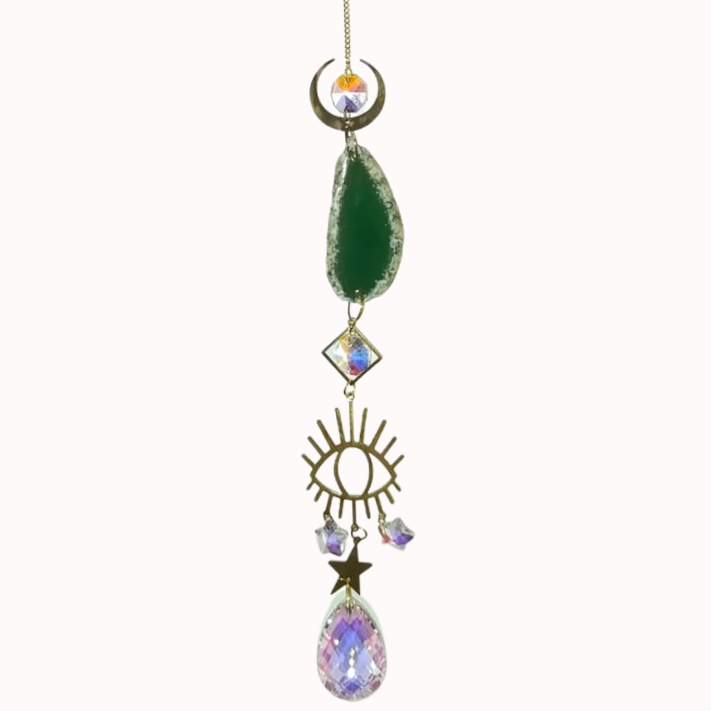 Conectá con la naturaleza y la protección espiritual con este exclusivo atrapasol. Esta pieza artesanal destaca por una piedra ágata natural en verde bosque, combinada con dijes de luna y un ojo místico central que simboliza la vigilancia y la buena fortuna. Sus cristales facetados con acabado aurora boreal transforman la luz en destellos mágicos, creando una atmósfera de paz y resguardo en tu hogar.