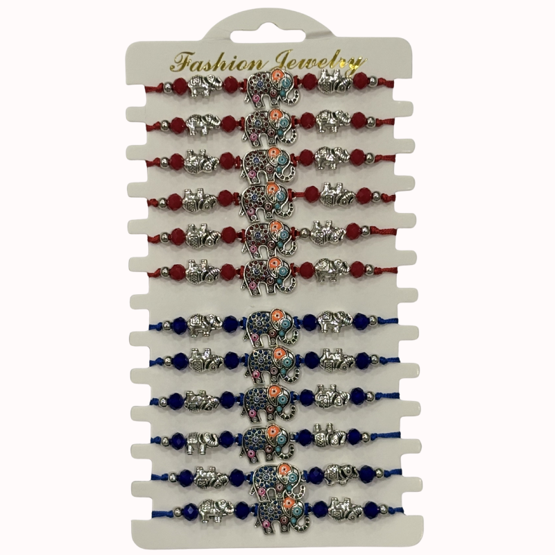 • Diseño: Pack de 12 pulseras ajustables en colores rojo y azul profundo. Destacan por un gran dije central de elefante con detalles esmaltados y cristales de colores, acompañados de dos elefantes plateados más pequeños y cuentas facetadas a los lados.