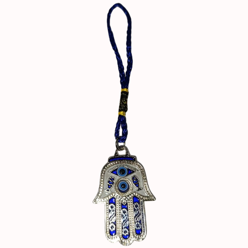 Añade un símbolo de paz y resguardo a tu día a día con este amuleto Hamsa de diseño tradicional. La pieza presenta un acabado plateado con elegantes detalles en esmalte azul y grabados de peces, símbolos de fertilidad y abundancia. En el centro, destaca el ojo turco protector, creando una pieza armoniosa que combina fe, tradición y un diseño artístico único.