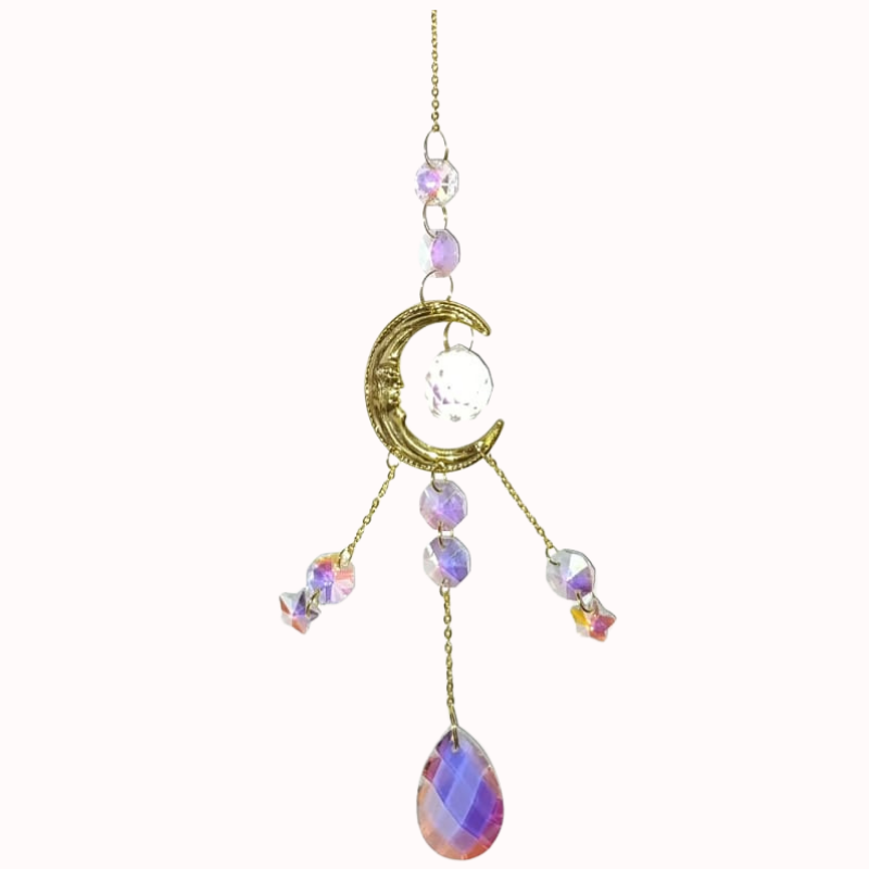 Añade un toque de luz mágica y serenidad a tus espacios con este encantador atrapasol. Presenta una detallada luna creciente dorada que sostiene una esfera de cristal en su interior, acompañada por delicadas cadenas que culminan en pequeños cristales y una gran gota central. Gracias a su acabado Aurora Boreal (AB), los cristales descomponen la luz solar en un espectro de colores vibrantes, creando una atmósfera mística y soñadora en cualquier habitación.