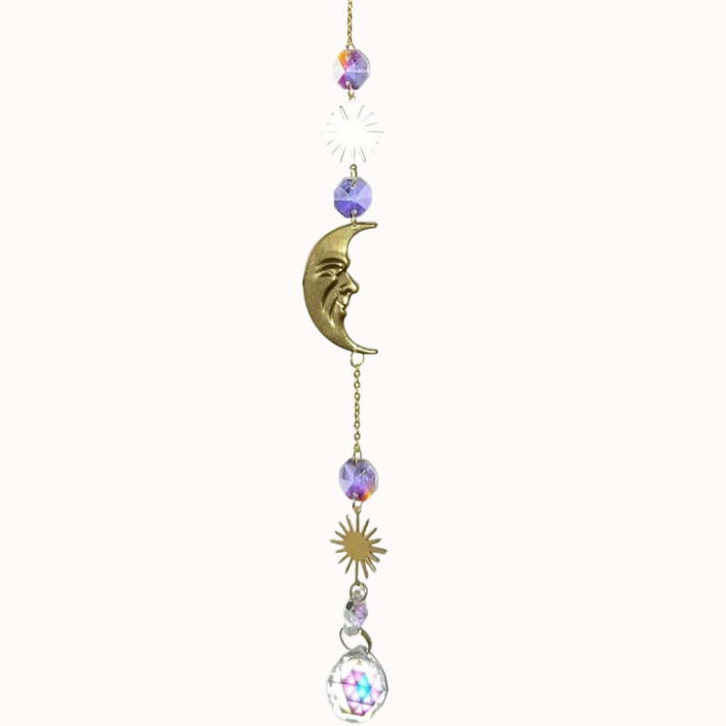 Añade un toque de equilibrio y magia celestial a tu hogar con este delicado atrapasol artesanal. El diseño presenta la unión simbólica de una luna creciente con rostro y un sol radiante en metal dorado, intercalados con cuentas de cristal en tonos violetas. Al ser alcanzado por la luz natural, su esfera final facetada proyecta una lluvia de pequeños arcoíris, transformando cualquier habitación en un espacio lleno de paz y luz vibrante.