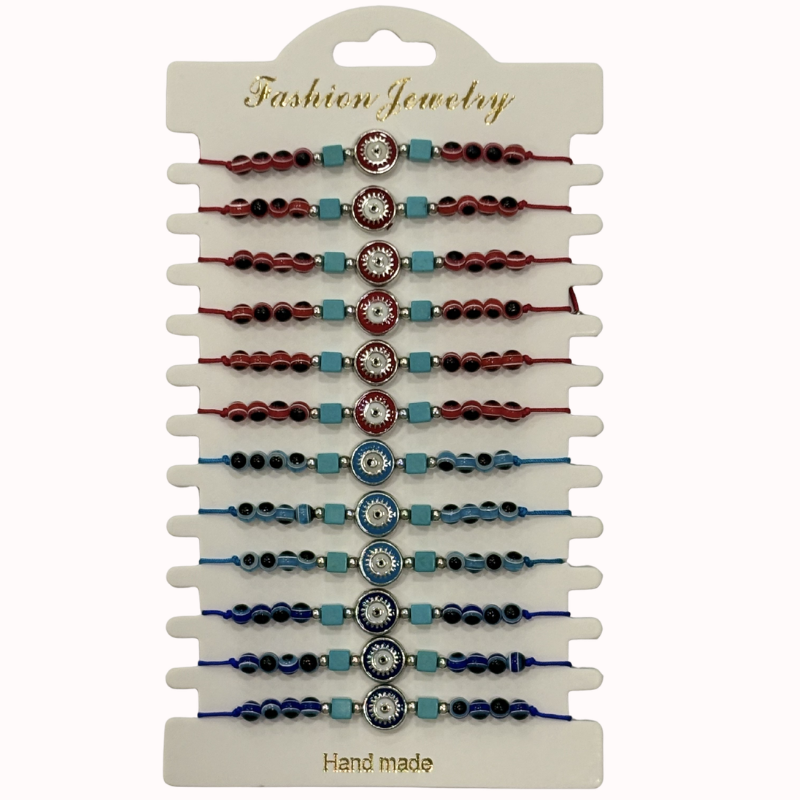 • Diseño: Pack surtido de 12 pulseras ajustables en tres colores vibrantes: rojo pasión, celeste cielo y azul profundo. Cada pulsera cuenta con cuentas de ojo turco esmaltadas que flanquean un dije central plateado, también con diseño de ojo místico. Intercaladas entre las cuentas de ojo, hay cuentas cuadradas de color turquesa, ofreciendo un contraste moderno y colorido.