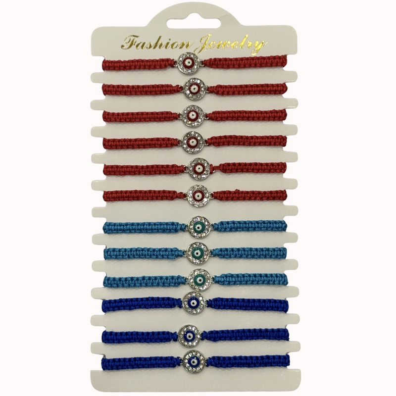 • Diseño: Pack de 12 pulseras elaboradas en tejido de macramé grueso en colores rojo, celeste y azul. El centro de cada pulsera luce un dije circular plateado con un ojo turco esmaltado, rodeado por una corona de cristales brillantes que resaltan su acabado artesanal.