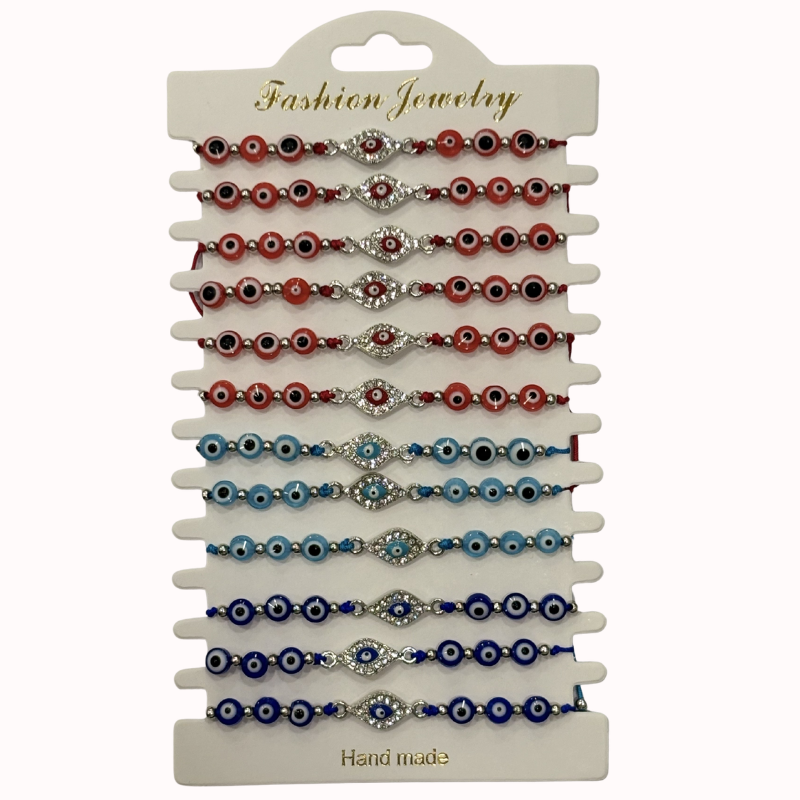 - Diseño: Presenta un diseño central de ojo místico enmarcado por cristales brillantes, acompañado de cuentas de “ojo turco” (nazar) a lo largo de la pulsera. Están disponibles en tres colores: rojo vibrante, celeste cielo y azul profundo.