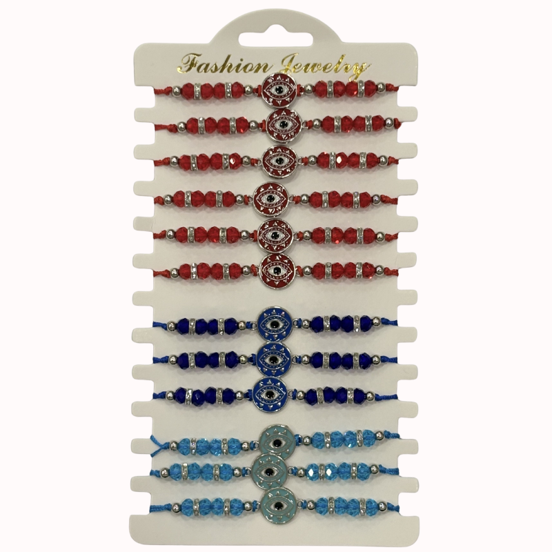Diseño: Pack de 12 pulseras ajustables en colores rojo, azul profundo y celeste. Presentan un importante dije central circular con el símbolo del ojo turco sobre un fondo esmaltado a tono, flanqueado por cristales facetados brillantes y separadores plateados con incrustaciones tipo strass.
