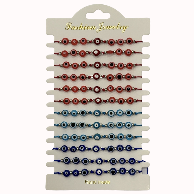 - Diseño: Presenta una serie de siete cuentas de “ojo turco” (nazar) distribuidas a lo largo de un cordón de hilo. Están disponibles en tres variantes de color: rojo vibrante, celeste cielo y azul profundo.