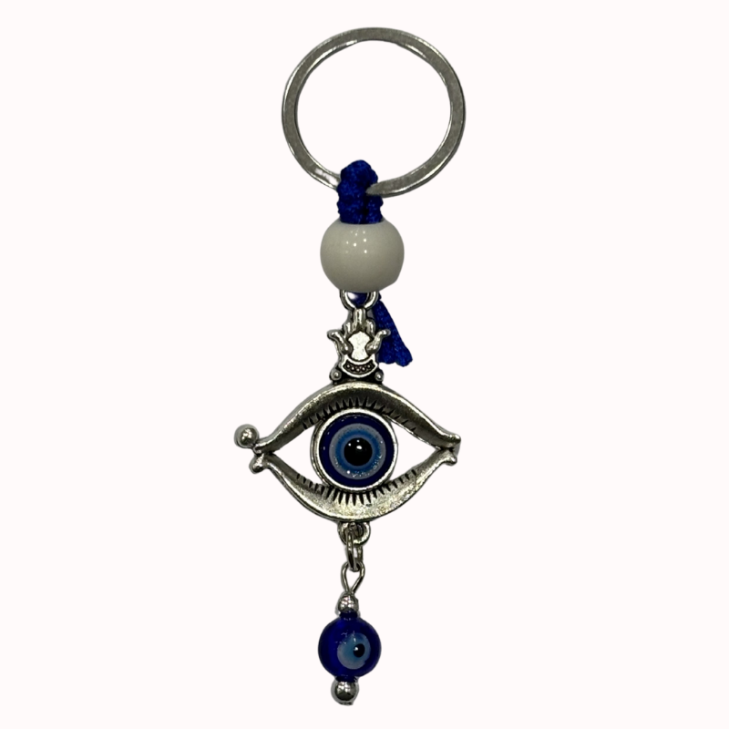 - Material: Está fabricado en metal con acabado plateado y detalles en hilo azul. Incluye una cuenta blanca superior y una pequeña esfera de ojo turco colgante, todo sujeto a una anilla metálica resistente para llaves o bolsos.