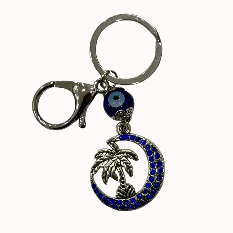 • Diseño: Presenta un dije central con una palmera enmarcada por una media luna decorada con cristales en azul cobalto brillante.