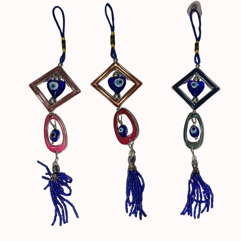 Dale un toque de amor y protección a tus ambientes con estos originales amuletos de diseño geométrico. Cada pieza combina un rombo metálico que enmarca un corazón azul central y un óvalo inferior con el tradicional ojo turco protector. Su acabado en colores vibrantes y la delicada borla de cuentas azules los convierten en el accesorio decorativo perfecto para quienes buscan equilibrio espiritual con un estilo moderno y colorido.