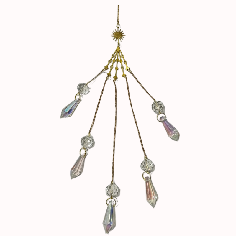 Elegancia y luz se unen en este diseño minimalista de inspiración celestial. Con una estructura en cascada, este atrapasol presenta un sol radiante central del que penden cinco caídas de cadenas doradas, cada una rematada con prismas facetados de alta refracción. Su acabado Aurora Boreal (AB) permite que cada gota de cristal capture la luz mínima y la transforme en múltiples destellos de colores, llenando tus espacios de una energía mágica y renovada.
