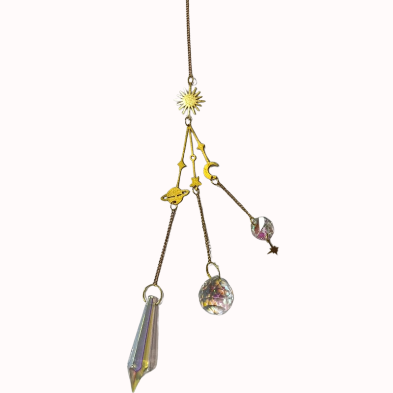 Añade un toque de asombro y elegancia interestelar a tu hogar con este delicado atrapasol galáctico. Su diseño colgante presenta una serie de dijes de soles, lunas y planetas en acabado dorado, que sostienen cristales facetados en tonos violetas y un prisma principal tipo péndulo. Al recibir la luz del sol, esta pieza proyecta un espectro de colores vibrantes, transformando cualquier habitación en un espacio mágico y soñador.