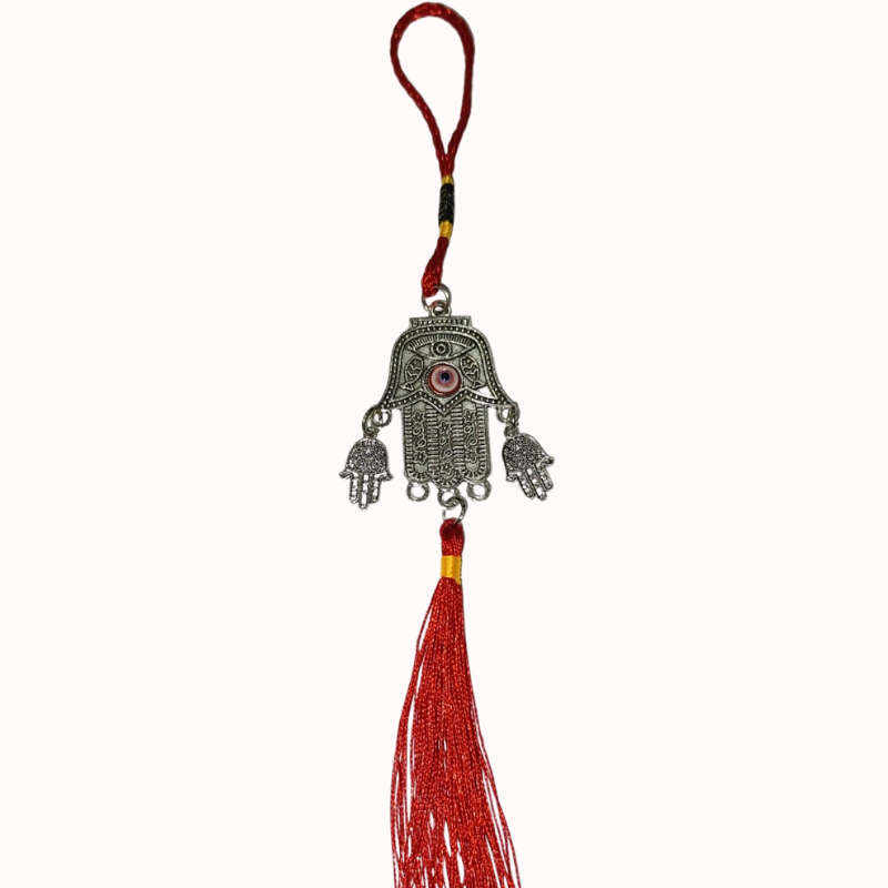 Lleva la protección a otro nivel con este diseño único que integra tres manos de Fátima en una sola pieza artesanal. El centro cuenta con un ojo turco rojo que añade un toque de energía y vitalidad, mientras que los grabados detallados resaltan su estilo étnico. Es un accesorio cargado de simbolismo, ideal para quienes buscan un amuleto distintivo que combine fe y decoración.